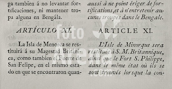 alb5432900 Preliminary articles of the Treaty concluded at Fontainebleau on 3 November 1762 between the kingdoms of France and Spain. France ceded to Spain the historic North American territory of Louisiana, one of the administrative divisions of New France (the area colonised by France in North America). Article XI (on the restitution by France to Great Britain of the island of Minorca and the Fort St. Philip). Collection of the Treaties of Peace, Alliance, Commerce adjusted by the Crown of Spain with the Foreign Powers (Colección de los Tratados de Paz, Alianza, Comercio ajustados por la Corona de España con las Potencias Extranjeras). Volume III. Madrid, 1801. Historical Military Library of Barcelona, Catalonia, Spain.
