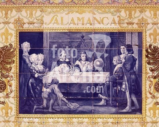orz046365 COLON EXPONE SUS PLANES A LOS REYES CATOLICOS ANTE EL PROFESOR DE PRIMA DE SALAMANCA - MOSAICO DE AZULEJOS DE LA PLAZA DE ESPAÑA DE SEVILLA. Location: España Square. Sevilla. Seville. SPAIN. Catholic Monarchs. CRISTOBAL COLON (1451/1506). ISABEL LA CATOLICA (1451-1504) ISABEL I DE CASTILL. FERNANDO EL CATOLICO (1452-1516) FERNANDO II ARAGO.