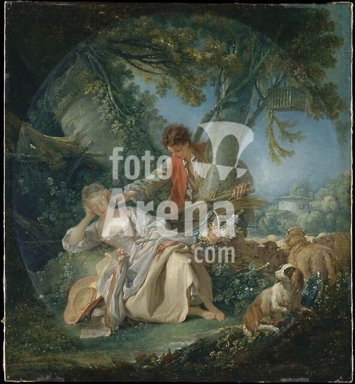 alb3607496 The Interrupted Sleep. Artist: François Boucher (French, Paris 1703-1770 Paris). Dimensions: Overall 32 1/4 x 29 5/8 in. (81.9 x 75.2 cm); painted surface (irregular oval) 31 x 27 3/4 in. (78.7 x 70.5 cm). Date: 1750.Boucher was an artist of incomparable virtuosity and industry with a preference for mythological and pastoral subjects. Here he shows a beautifully dressed shepherd and shepherdess. The simplicity of the subject belies the complexity of the composition, which is organized around a series of intersecting diagonals. The canvas, much admired at the Salon of 1753, was one of a pair of overdoors from Bellevue, a château belonging to Madame de Pompadour, mistress of Louis XV. Museum: Metropolitan Museum of Art, New York, USA. Author: Francois Boucher.