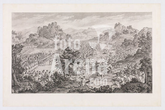 alb3629783 The Great Victory of Qurnam. Artist: Augustin de Saint-Aubin (French, Paris 1736-1807 Paris); (direxit) Charles Nicolas Cochin II (French, Paris 1715-1790 Paris); after Giovanni Damasceno Salusti (1727-1781). Dimensions: Sheet: 39 5/8 × 25 13/16 in. (100.7 × 65.5 cm)Plate: 37 1/16 × 22 11/16 in. (94.1 × 57.7 cm). Series/Portfolio: The Conquests of the Emperor of China(Les Conquêtes de l'Empereur de la Chine). Date: 1770.The event shown is the 1759 battle of Qurnam in which Qing troops defeat the enemy at the end of the Qianlong Emperor's East Turkestan campaign.Part of a set of sixteen, "The Great Victory of Qurnam" was commissioned by the Qianlong Emperor in 1765 to commemorate Manchu victories (1755-59) over the Eleuths, the Dzungars, and other Central Asian peoples in the present-day region of Xinjiang. Made under the direction of Charles-Nicolas Cochin (1715-1790), the prints, which follow reduced-scale copies of paintings by Jesuit artists working in Beijing, were etched and engraved in France from 1767 to 1774 by the finest printmakers at the court of Louis XV. The Chinese merchants of Canton (present-day Guangzhou) paid for the copper plates and two hundred sets of prints to be delivered to China, with only a few sets retained in Paris.The prints exemplify the fusion of Eastern and Western representational styles fostered within the Qing imperial painting academy. The European technique of chiaroscuro-the modeling of forms through the use of light and shading-has been visibly tempered, as has the use of one-point perspective. Instead, the scenes present panoramic views and strongly up-tilt ground planes. At the same time, howevery, they reflect European preferences for anatomical accuracy, a single light source, and the mathematically correct reduction of scale to create the illusion of recession. Museum: Metropolitan Museum of Art, New York, USA.