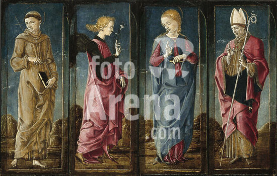 alb3706523 The Annunciation with Saint Francis and Saint Louis of Toulouse [four panels]. Dated: c. 1470/1480. Dimensions: framed (overall, all four panels): 43.5 × 69.22 × 8.26 cm (17 1/8 × 27 1/4 × 3 1/4 in.) overall (each panel): 31 × 12.4 cm (12 3/16 × 4 7/8 in.) framed (each panel): 43.5 × 16.8 × 4.4 cm (17 1/8 × 6 5/8 × 1 3/4 in.). Medium: tempera and distemper on panel. Museum: National Gallery of Art, Washington DC. Author: Cosme Tura.