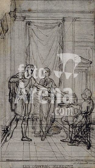 alb4143330 Study for Vignette in Jean François Marmontel's "Contes Moraux". Hubert François Gravelot; French, 1699-1773. Date: 1753-1773. Dimensions: 129 × 74 mm. Pen and black ink over black chalk, on gray laid paper, laid down on ivory laid paper. Origin: France. Museum: The Chicago Art Institute, USA.