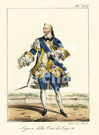 alb9870052 Costume of a nobleman at the court of King Louis XV of France. In powdered wig, coat, waistcoat and breeches richly decorated with lace and gold embroidery. With buckle shoes and sword. Seigneur de la Cour de Louis XV. Handcoloured lithograph by Lorenzo Bianchi and Domenico Cuciniello after Hippolyte Lecomte from Costumi civili e militari della monarchia francese dal 1200 al 1820, Naples, 1825. Italian edition of Lecomtes Civilian and military costumes of the French monarchy from 1200 to 1820.