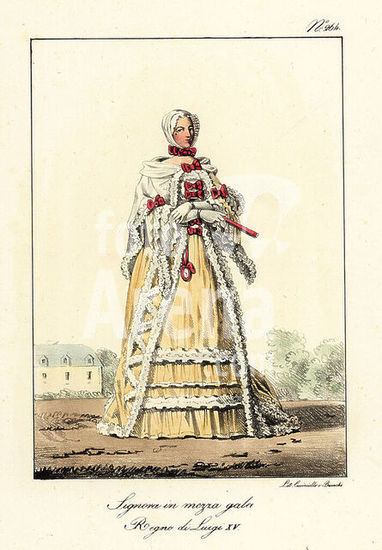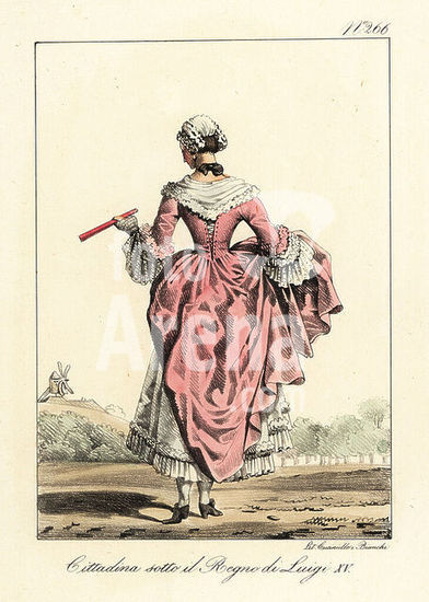 alb9870419 Rear view of the costume of a French bourgeois woman, mid-18th century. In dress with lace collar, cuffs and petticoats, bonnet and fan. Bourgeoise sous le Regne de Louis XV. Handcoloured lithograph by Lorenzo Bianchi and Domenico Cuciniello after Hippolyte Lecomte from Costumi civili e militari della monarchia francese dal 1200 al 1820, Naples, 1825. Italian edition of Lecomtes Civilian and military costumes of the French monarchy from 1200 to 1820.