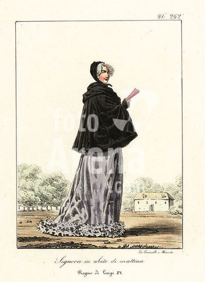 alb9870580 Young French woman in morning dress, era of King Louis XV. She wears a tight bonnet, short black cape, long velvet gown. Jeune Dame en neglige du matin. Regne de Louis XV. Handcoloured lithograph by Lorenzo Bianchi and Domenico Cuciniello after Hippolyte Lecomte from Costumi civili e militari della monarchia francese dal 1200 al 1820, Naples, 1825. Italian edition of Lecomtes Civilian and military costumes of the French monarchy from 1200 to 1820.