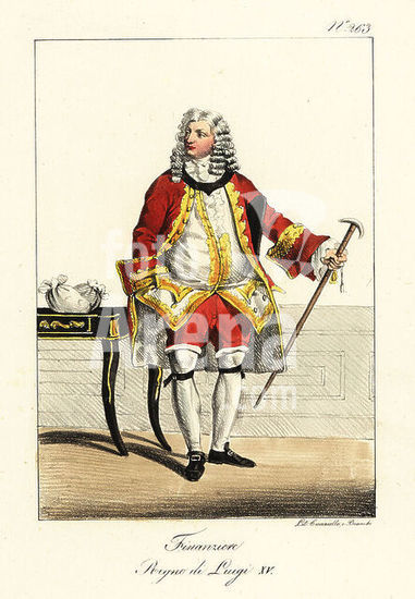 alb9870582 Costume of a banker during the reign of King Louis XV of France, 1723-1774. In wig, gold-embroidered velvet jacket, waistcoat and breeches, with bags of money. Financier. Regne de Louis XV. Handcoloured lithograph by Lorenzo Bianchi and Domenico Cuciniello after Hippolyte Lecomte from Costumi civili e militari della monarchia francese dal 1200 al 1820, Naples, 1825. Italian edition of Lecomtes Civilian and military costumes of the French monarchy from 1200 to 1820.