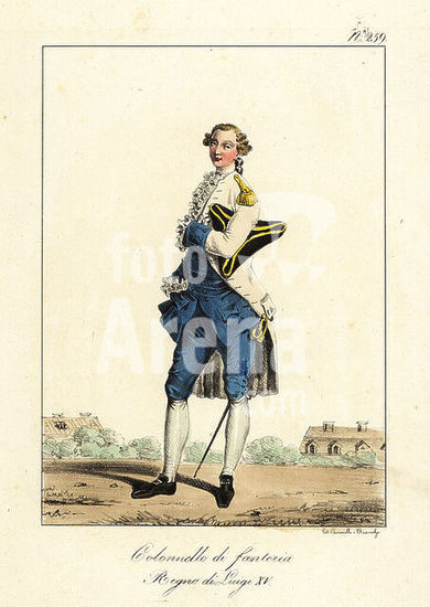 alb9875200 Colonel of the French Infantry, era of King Louis XV, 1723-1774. In wig, white coat with gold epaulettes, blue jacket and breeches, buckle shoes, with tricorn and sword. Colonel d'Infanterie. Regne de Louis XV. Handcoloured lithograph by Lorenzo Bianchi and Domenico Cuciniello after Hippolyte Lecomte from Costumi civili e militari della monarchia francese dal 1200 al 1820, Naples, 1825. Italian edition of Lecomtes Civilian and military costumes of the French monarchy from 1200 to 1820.