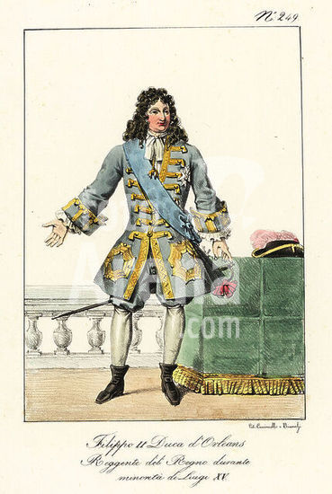 alb9876356 Philippe II, Duke of Orleans, 1674-1723, French royal, soldier, and statesman who served as Regent of France. In blue coat with gold frogging, cravatte, breeches, hose, bootlets, with court sword. Philippe II. Duc d'Orleans. Regent du Royaume pendant le minorite de Louis XV. Handcoloured lithograph by Lorenzo Bianchi and Domenico Cuciniello after Hippolyte Lecomte from Costumi civili e militari della monarchia francese dal 1200 al 1820, Naples, 1825. Italian edition of Lecomtes Civilian and military costumes of the French monarchy from 1200 to 1820.