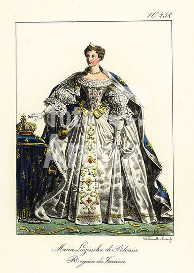 alb9878428 Maria Karolina Zofia Felicja Leszczyska, 1703-1768, Queen of France as the wife of King Louis XV. In bejeweled ceremonial robes and rich ermine-lined cape, with crown. Marie Leczinska de Pologne, Reine de France. Handcoloured lithograph by Lorenzo Bianchi and Domenico Cuciniello after Hippolyte Lecomte from Costumi civili e militari della monarchia francese dal 1200 al 1820, Naples, 1825. Italian edition of Lecomtes Civilian and military costumes of the French monarchy from 1200 to 1820.