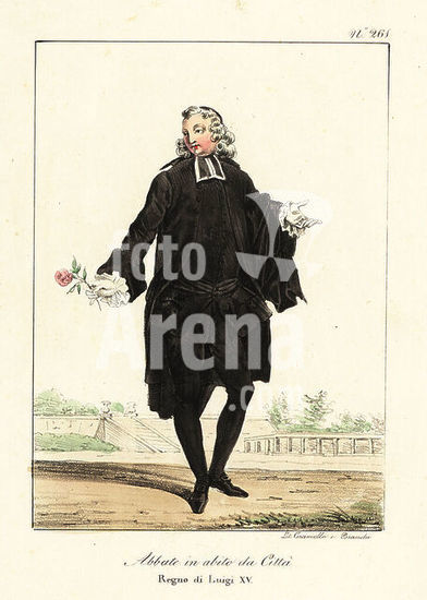 alb9880958 French abbot in town outfit, mid-18th century. He wears a black coat over black doublet, hose, buckle shoes. Abbe en habit de ville. Regne de Louis XV. Handcoloured lithograph by Lorenzo Bianchi and Domenico Cuciniello after Hippolyte Lecomte from Costumi civili e militari della monarchia francese dal 1200 al 1820, Naples, 1825. Italian edition of Lecomtes Civilian and military costumes of the French monarchy from 1200 to 1820.