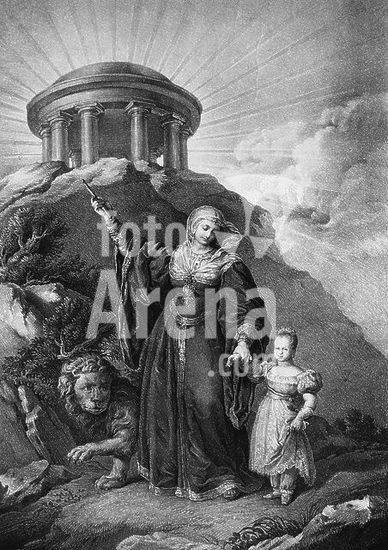 orz170178 LA REINA ISABEL LA CATOLICA GUIA A ISABEL II AL TEMPLO DE LA GLORIA - LITOGRAFIA S XIX. Author: VICENTE LOPEZ PORTAÑA. Location: MUSEO DEL ROMANTICISMO-GRABADOS. MADRID. SPAIN. ISABEL II REINA DE ESPAÑA (1830-1904). ISABEL LA CATOLICA (1451-1504) ISABEL I DE CASTILL.