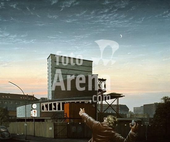 akg677337 Berlin, Berliner Mauer (erbaut seit dem 13.August 1961; Abriß nach dem 9.November 1989).-"Aussichtsplattform an der Mauer".-(Mauer an der Niederkirchnerstraße mit Martin-Gropius-Bau, Preuß.Landtag und Haus der Ministerien). Gemälde, 1987, von Matthias Koeppel (geb.1937). Öl/Lw., 120 x 160 cm.