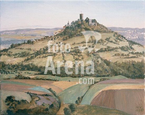 akg580823 Krofdorf-Gleiberg (Gemeinde Wettenberg, Hessen), Burg Gleiberg (1. Hälfte 10. Jh., Bergfried 12. Jh.; im 17. Jh. zerstört). "Burg Gleiberg (Hessen) ". Gemälde, 1983, von Matthias Koeppel. (geb. 1937). Aus dem Zyklus: Deutsche Landschaften. Öl auf Leinwand, 24 × 30 cm. Privatsammlung. Museum: PRIVATE COLLECTION. Copyright: © Matthias Koeppel. This artwork is not in the public domain. It is your responsibility to obtain all necessary third party permissions from the copyright handler in your country prior to publication.