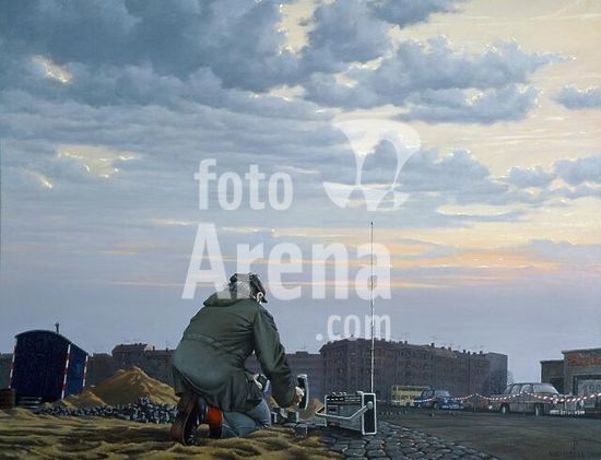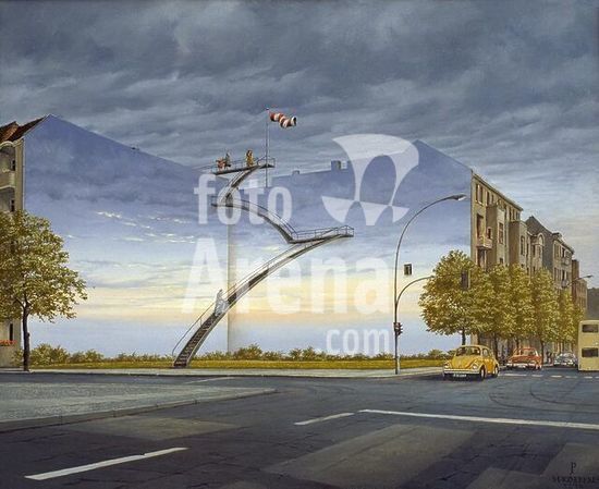 akg564945 Koeppel, Matthias. geb. 1937. "Mommsen - Ecke Leibnizstraße (II.) ". (Entwurf einer Aussichtsplattform zur Betrachtung von Sonnenuntergängen), 1978. Öl auf Leinwand, 75 × 94 cm. Privatsammlung. Museum: PRIVATE COLLECTION. Copyright: © Matthias Koeppel. This artwork is not in the public domain. It is your responsibility to obtain all necessary third party permissions from the copyright handler in your country prior to publication.