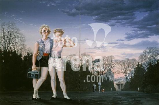 akg580763 Koeppel, Matthias; geb. 1937. "Requiem für Luise" (Diptychon), 1984. (Die Popsängerinnen Annette und Inga Humpe in der Haltung der Prinzessinnengruppe Luise und Friederike von Preußen von Johann Gottfried Schadow; im Hintergrund das Mausoleum im Schlosspark Charlottenburg). Öl auf Leinwand, 160 × 240 cm. Berlin, Stiftung Stadtmuseum Berlin. Museum: Berlin, Stiftung Stadtmuseum Berlin. Copyright: © Matthias Koeppel. This artwork is not in the public domain. It is your responsibility to obtain all necessary third party permissions from the copyright handler in your country prior to publication.