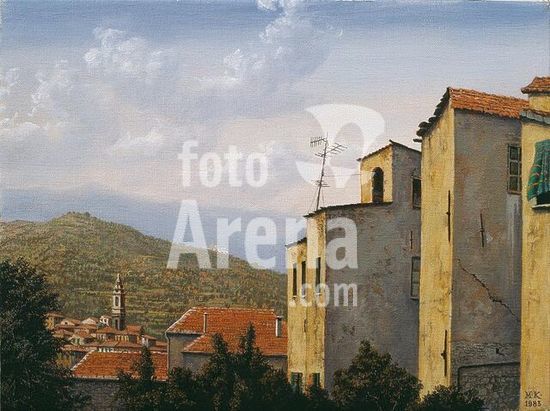akg580620 Dolcedo (Liguria, Italy). - "Blick auf Dolcedo (Ligurien) " (View of Dolcedo, Liguria).Painting. 1983, by Matthias Koeppel (born 1937). Oil on canvas, 50 × 70 cm. Private Collection. Museum: PRIVATE COLLECTION. Copyright: © Matthias Koeppel. This artwork is not in the public domain. It is your responsibility to obtain all necessary third party permissions from the copyright handler in your country prior to publication.