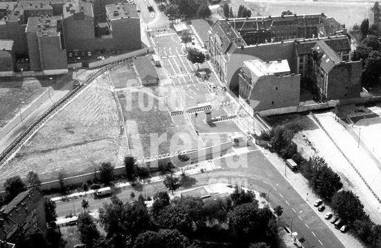 akg1568582 Berlin, Berliner Mauer (erbaut seit dem 13.August 1961; Abriß nach dem 9.November 1989). /-Grenzübergang Chausseestraße / Liesenstraße in Berlin-Wedding / Mitte.-Luftaufnahme, 1981.