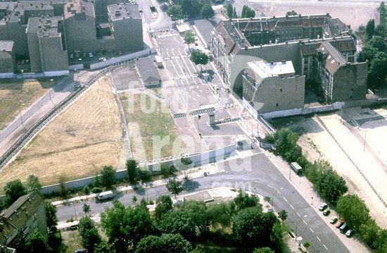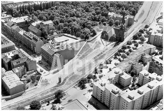 akg1568625 Berlin, Bezirk Wedding/Mitte, Bernauer Straße.-Luftbild Bernauer Straße: rechts die Versöhnungskirche, auf dem Todesstreifen stehend, wurde 1985 auf Befehl der DDR-Regierung gesprengt.-Foto, September 1982.