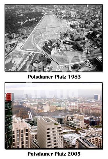 akg1570861 Berlin, Berliner Mauer-Sektorengrenze (erbaut seit dem 13.August 1961; Abriß nach dem 9.November 1989).-Ansichten des Potsdamer Platzes vor und nach dem Mauerfall: oben Luftbild von Süden auf den Mauerverlauf am Potsdamer Platz, Tiergarten, Reichstag, Brandenburger Tor und Leipziger Platz 1983; unten Blick vom Büro-und Geschäftshaus Potsdamer...