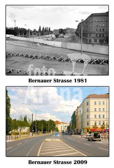 akg1568617 Berlin, Germany. Berlin Wall (1961 - 1989). View of Bernauer Straße with Berlin Wall, photo 1981 (top). View of Bernauer Straße after the fall of the Berlin Wall, photo 2009 (bottom). Photo postcard.