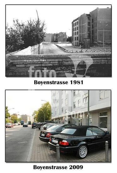 akg1568676 Berlin, Germany. Berlin Wall (1961 - 1989). View of Chausseestraße, photo, 1981. View of Chausseestraße, corner of Boyenstraße after the fall of the Berlin Wall, photo, 2009. Photo postcard.