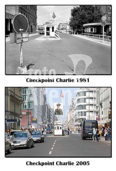 akg1569714 Berlin, Germany. Berlin Wall (1961 - 1989). View of Checkpoint Charley, photo 1981 (top). View of Checkpoint Charley (after the fall of the Berlin Wall just a tourist attraction) photo 2005. Photo postcard.