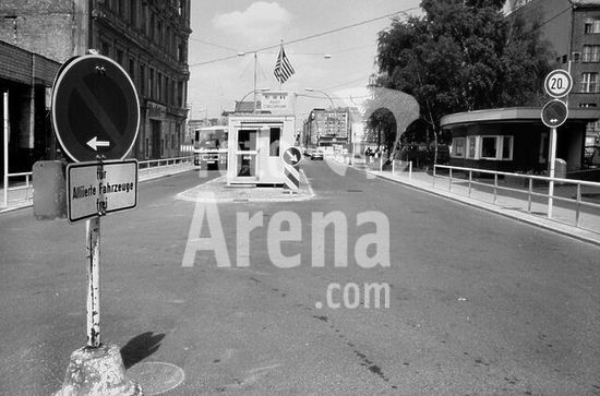 akg1570382 Berlin, Germany. Berlin Wall. View of Checkpoint Charley towards East Berlin (Friedrichstrasse border crossing). Photo, 1981.