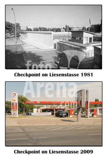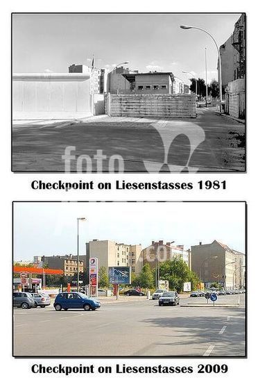 akg1570452 Berlin, Germany. Berlin Wall (1961 - 1989). View of Chausseestraße Checkpoint, photo 1981 (top). View of Chausseestraße corner of Liesenstraße after the fall of the Berlin Wall, photo 2009 (bottom). Photo postcard.