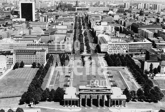 akg1571012 Berlin, Germany. Berlin Wall. Aerial view of the Brandenburg Gate towards East Berlin. Photo, 1983.