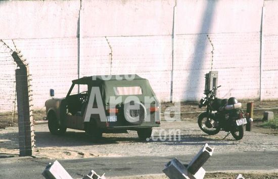 akg396966 Berlin, Berlin Wall - Sector border. Cross-country vehicle and motorbike of GDR border tropps in front of concrete wall of border construction. Photo, July 1982.
