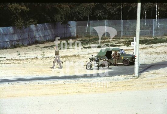 akg396967 Berlin, Berlin Wall - Sector border. Soldiers of GDR border troops with a cross-country vehicle and motorbike on the strip in front of the Wall. Photo, July 1982.