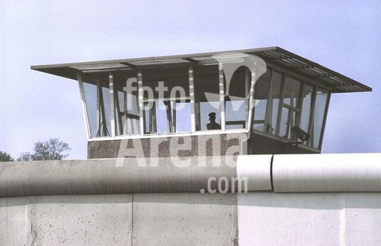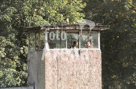 akg396980 Berlin, Germany. Berlin Wall - Sector border. GDR watchtower with border guards. Photo, July 1981.
