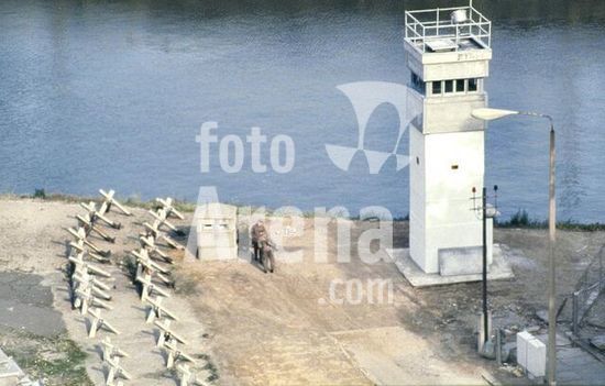 akg396986 Berlin, Berlin Wall - Sector border. GDR watchtower and border guards at a river bank. Aerial photo, July 1982.