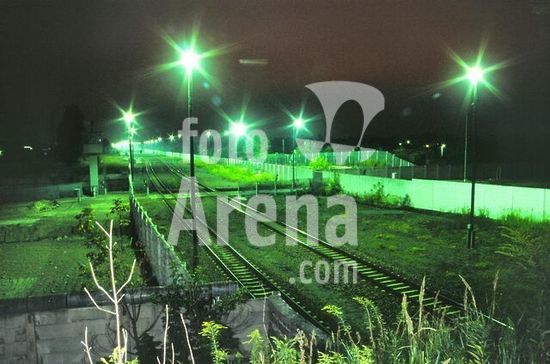 akg397223 Berlin, Germany. Berlin Wall - Sector Borders. Sector border with watchtower at the crossing of the transit railway from West Berlin to West Germany. Photo taken at night, November 1981.