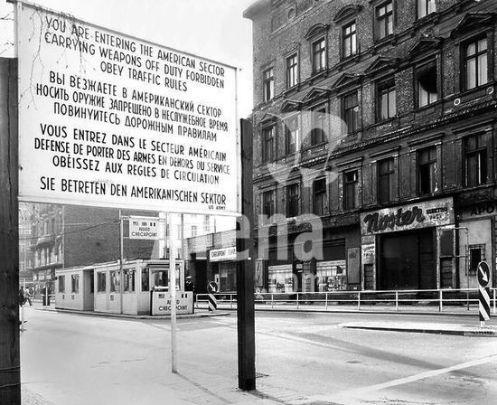 akg1570401 Berlin, Germany. Berlin Wall. Border crossing Friedrichstrasse / Checkpoint Charlie:. View of a sign in four languages saying "You enter the American Sector" at Checkpoint Charlie, on the West Berlin side. Photo, 1981.