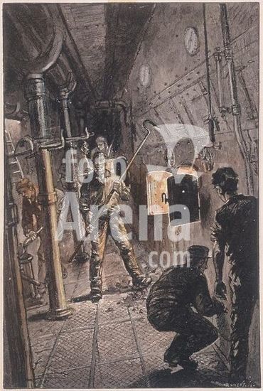 akg395746 Verne, Jules; French author (1828-1905). Works: P'tit Bonhomme (Foundling Mick, novel, 1893). Chapter XIII "Changement de couleur et d'état": Grip, fireman on the 'Vulcan', in front of the boiler of the ship. Woodcut after a drawing by L.Benett from the first edition of "Voyages Extraordinaires", Paris (Coll. Hetzel), 1893.