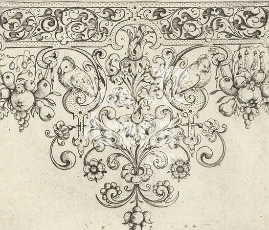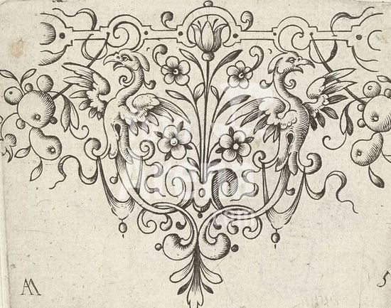 alb15560137 Amsterdam, Muntinck, Adriaen, Micker, Laurent Jansz, Spitsen, Spits with two birds and fruit trophies, At the top a border with tendrils. Sheet 7 from a series of 6., print, ornamental print, prints, ornamental prints, height 98 mm, width 108 mm, print maker, printmaker, 1675 - 1700, fourth quarter 17th century, paper, engraving, engraving (printing process), Work conception, Northern Netherlands, after a design by, Publication (Event), Publication, publisher.