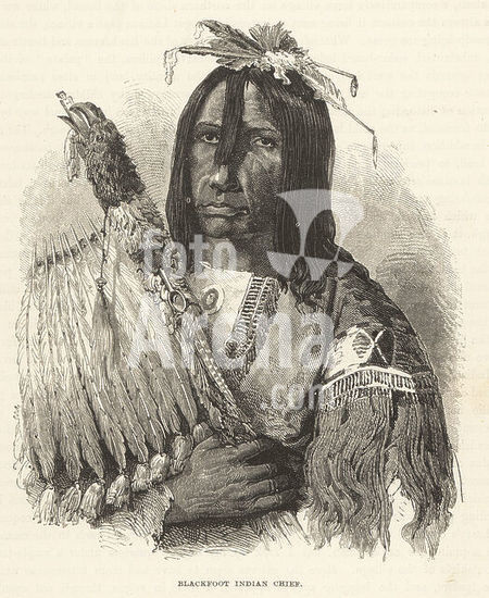alb18725412 Stu-mick-o-sucks, Buffalo's Back Fat, head chief of the Blackfoot nation. Long hair parted with forelock, feather headdress, in embroidered buckskin coat, holding a peace pipe. Blackfoot Indian Chief. Woodcut from Robert Brown's The Races of Mankind, Cassell, Petter and Galpin, London, 1873.