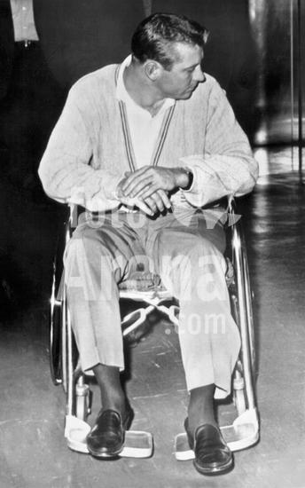 990_05_3-Sport-BaseB-Pers-MM_12HR New York, New York: May 19, 1962.New York Yankee baseball star Mickey Mantle in a wheelchair at Lenox Hil Hospital after tearing a thigh muscle while running out a groundball in the 9th inning in a game against the MInnesota Twins. The Twins won, 4-3.