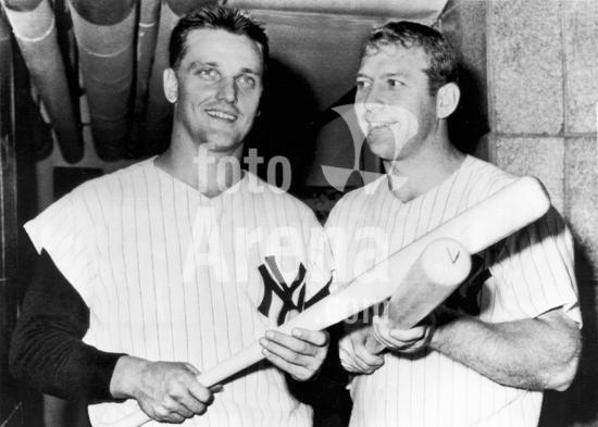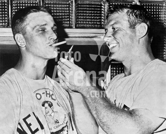 990_05_3-Sport-BaseB-Pers-MM_13HR New York, New York: July 13, 1961.New York Yankee slugger Roger Maris gets a light for his cigarette from teammate Mickey Mantle after they hit back to back home runs in the first inning against the Chicago White Sox.
