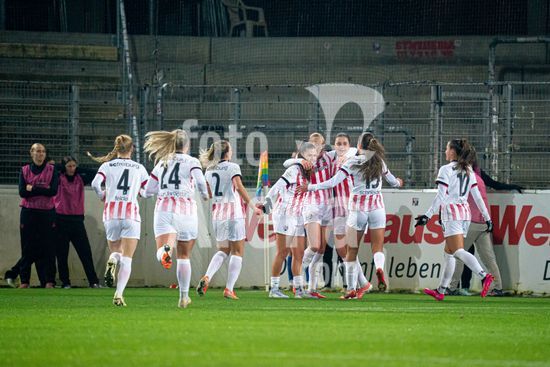 2840926 Tessa Blumenberg (7 SC Freiburg) comemorando com a equipe apos marcar o segundo gol do time durante a partida entre SC Freiburg e Bayer 04 Leverkusen no Dreisamstadion, em Freiburg, Alemanha. (Priscila Bütler / SPP)