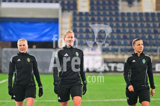 2840931 A arbitra Tess Olofsson com as assistentes Almira Spahic e Alisa Levalampi antes do jogo da Liga Sueca OBOS Damallsvenskan em 10 de novembro de 2025 entre Linkoping FC e Kristianstads DFF na Bilborsen Arena em Linkoping, Suecia (Peter Sonander/SPP)