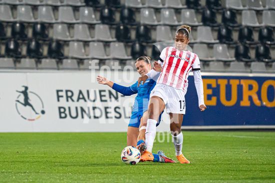 2840860 Aurelie Csillag (17 SC Freiburg), a direita, e Julia Mickenhagen (18 Bayer Leverkusen), a esquerda, em acao durante a partida entre SC Freiburg e Bayer 04 Leverkusen em Dreisamstadion, Freiburg, Alemanha. (Priscila Bütler / SPP)