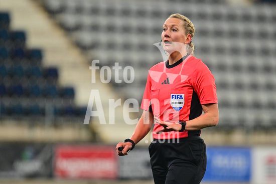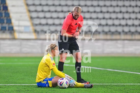 2840949 Arbitro Tess Olofsson e Cajsa Andersson (1 Linkoping FC) durante o jogo na Liga Sueca OBOS Damallsvenskan em 10 de novembro de 2025 entre Linkoping FC e Kristianstads DFF na Bilborsen Arena em Linkoping, Suecia (Peter Sonander/SPP)