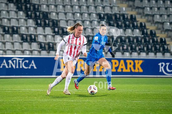 2840932 Michelle De Jongh (18 Linkoping FC) e Amy Sayer (17 Kristianstad) no jogo da Liga Sueca OBOS Damallsvenskan em 10 de novembro de 2025 entre Linkoping FC e Kristianstads DFF na Bilborsen Arena em Linkoping, Suecia (Peter Sonander/SPP)