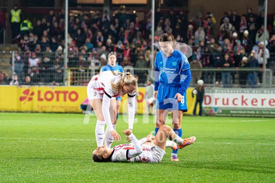 2840956 Nia Szenk (19 SC Freiburg) se lesiona durante a partida entre SC Freiburg e Bayer 04 Leverkusen no Dreisamstadion, Freiburg, Alemanha. (Priscila Bütler / SPP)
