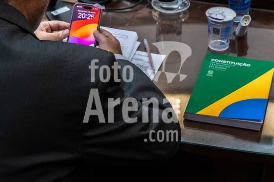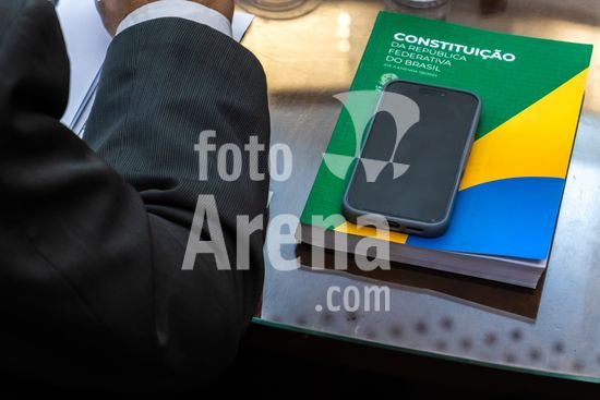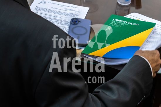 2881663 Sessão na Câmara Municipal de Marília, no centro da cidade de Marília, SP. A conexão entre a legislação e a tecnologia no cotidiano do poder público. Em destaque, sobre a mesa de um parlamentar, um exemplar da Constituição da República Federativa do Brasil, a lei fundamental do país, tem sobre si um smartphone. A cena representa a união entre a tradição das leis que regem a nação e as ferramentas digitais modernas, essenciais para a comunicação e o acesso rápido à informação no exercício da função pública. Ideal para política, direito e tecnologia, bem como para abordar a organização dos Três Poderes, cidadania, os direitos e deveres do cidadão, e a evolução da sociedade na era digital.