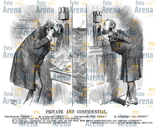 "Private and Confidential. Lord Salisbury. ""Hallo!"" M Le President. ""Hallo!"" Lord Salisbury. ""You there?"" M Le President. ""All there!"" Lord Salisbury. ""Can you suggest an entree for dinner?"" M Le President. ""Homard au gratin, — and, by the way, how about Newfoundland and lobster question?"" Lord Salisbury. ""Not by telephone, thank you!!!"" [Telephone between London and Paris opened, Monday, March 23rd."