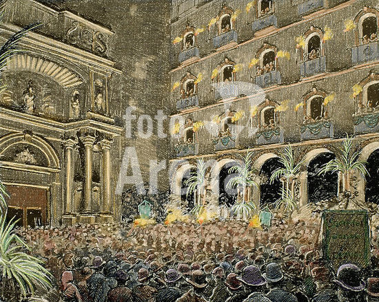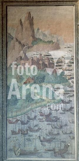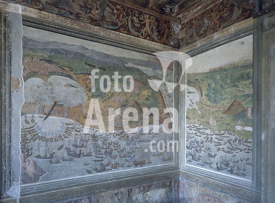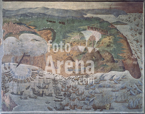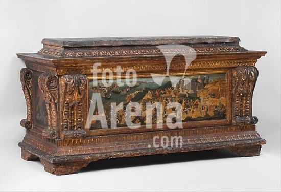 Cassone with painted front panel depicting the Conquest of Trebizond. Culture: Italian, Florence. Dimensions: H. 39-1/2 x W. 77 x D. 32-7/8 in. (100.3 x 195.6 x 83.5 cm); Painted surface 15 1/4 x 49 1/2 in. (38.7 x 125.7 cm). Maker: Attributed to workshop of Apollonio di Giovanni di Tomaso (Italian, Florence ca. 1416-1465 Florence); and workshop of Marco del Buono Giamberti (Italian, Florence 1402-1489 Florence). Date: after ca. 1461.Purchased in 1913 from the Florentine dealer Stefano Bardini (1836-1922), this elaborate chest, or cassone, has long enjoyed status as one of the few fifteenth-century objects of its kind to survive intact and, moreover, to portray a contemporary historical event--the conquest of Trebizond, the last outpost of the Byzantine Empire, by Mehmed II in 1461 (for another example of a cassone panel depicting a contemporary historical event, see 07.120.1). This status has been called into question by a detailed, technical examination undertaken in 2008. It has now been demonstrated that so far from being intact, various parts of the chest are not integral and that, most importantly, the painted front may originate from another chest. This means that the purported provenance of the chest from Palazzo Strozzi, first asserted by Weisbach [see Ref. 1913], may have no bearing on the interpretation of the scene on the painted front. That the chest itself is connected with some member of the Strozzi family is clear from the emblems that appear on the end pieces, which are original to it: the Strozzi falcon or hawk perched on a caltrop (spiky metal devices that, when scattered on the ground, destabilize the enemy's horses) with a banderole inscribed ME[Z]ZE--perhaps indicating another Strozzi emblem, the half-moon crescent [see Ref. Nickel 1974]. The inside of the lid and the back of the cassone retain their original stenciled patterns simulating patterned fabric, and the top of the lid is embellished by a gessoed piece of cloth that is gilded and tooled to simulate a runner of cut velvet (this motif is worn, the paint having been almost entirely lost, so that the design is barely legible today). The scene on the painted front is universally recognized as coming from the most active and prestigious workshop for the production of painted cassone in mid-fifteenth-century Florence: that shared by Apollonio di Giovanni and Marco del Buono. Its subject is neither biblical nor mythological, nor even based on a contemporary novella such as those by Boccaccio. Rather, it depicts an event that unfolds before two identifiable cities of the Byzantine Empire. Much work has been done identifying the places shown [see especially Refs. Paribeni 2001, Paribeni 2002, and Lurati 2005]. In the left background, clearly labeled on its walls, is Constantinople. An attempt has been made by the artist to suggest a number of the city's landmarks and distinguishing topographical features, some of which are also labeled. There is the Latin church of San Francesco; the monumental column of Justinian in the Augustaion and the Egyptian obelisk (evidently topped by a crescent) in the Hippodrome originally laid out by Emperor Septimus Severus in the third century AD and further embellished by Constantine; the Hagia Sofia; the nearby sixth-century church of Saint Irene; what must be intended either as the Blachernae Palace or its thirteenth-century annex, the Palace of Porphyrogenitus, which served as the imperial residence for the last Byzantine emperors (the fragmentary inscription may possibly have been intended as [PALAZZO] DEILO [IM]PER[AT]ORI); the Golden Horn--the city's fabled inlet that was protected by a chain that could be drawn across it--with western ships (carracks) moored next to the Genoese quarter of Pera, the walls of which are dominated by the great circular Galata tower, atop which the Genoese flag can be seen. Other boats in the Golden Horn and the Sea of Marmara may be either Greek dromons or Ottoman. Further back, on the European side of the Bosphorus, is the CHASTEL NVOVO (the "new fortress" of Rumeli Hisari built by Mehmed II in 1451-52 in preparation for the seige of Constantinople; its distinctive towers are still a landmark today). Across the Bosphorus is another walled city designated as LO SCUTARIO--Scutari, present-day Üsküdar (the name, Skutarion, derived from the leather shields of the Roman soldiers stationed there; it fell to the Ottomans almost a century before Constantinople). Then, dominating the hill on the right is the walled city of Trebizond (modern-day Trabzon). Located on the southern coast of the Black Sea, it became the seat of a separate Byzantine empire when it was conquered by Alexios Komenos in 1204--the year Constantinople fell to the crusaders--and was the last outpost of the Byzantine Empire following the conquest of Constantinople by the Ottomans in 1453. It fell to the Ottomans in 1461, marking the final demise of Byzantium. Although hardly an accurate depiction, it seems clear that for his depiction of Constantinople the artist was supplied with descriptions and maps, such as the one included in Cristoforo Buondelmonti's Liber insularum Archipelagi of 1420 [see Ref. Pope-Hennessy and Christiansen 1980] as well as, possibly, drawings by that inveterate traveler Cyriac of Ancona and the reports of other visitors to the city [see Ref. Lurati 2005].Before the walled city of Trebizond is depicted a battle. An encampment of tents is shown on the far right, in front of which the leader of one of the armies is seated on a triumphal chariot drawn by two white horses. He wears a turban, as do other members of his army, including the troops emerging behind Scutari, and he points his white baton towards a gesticulating, bearded figure who, dressed in blue, wears the sort of cylindrical hat splayed out at the top that was associated in Western Europe with the Byzantine Greeks [see Ref. Lurati 2005]; he rides a black steed and is plainly either reporting on the p