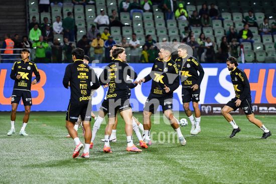 2837077 Time do Santos durante partida entre Palmeiras x Santos, válida pela trigésima segunda rodada do Campeonato Brasileiro de Futebol 2025, nesta quinta feira (6), no Allianz Parque, SP.